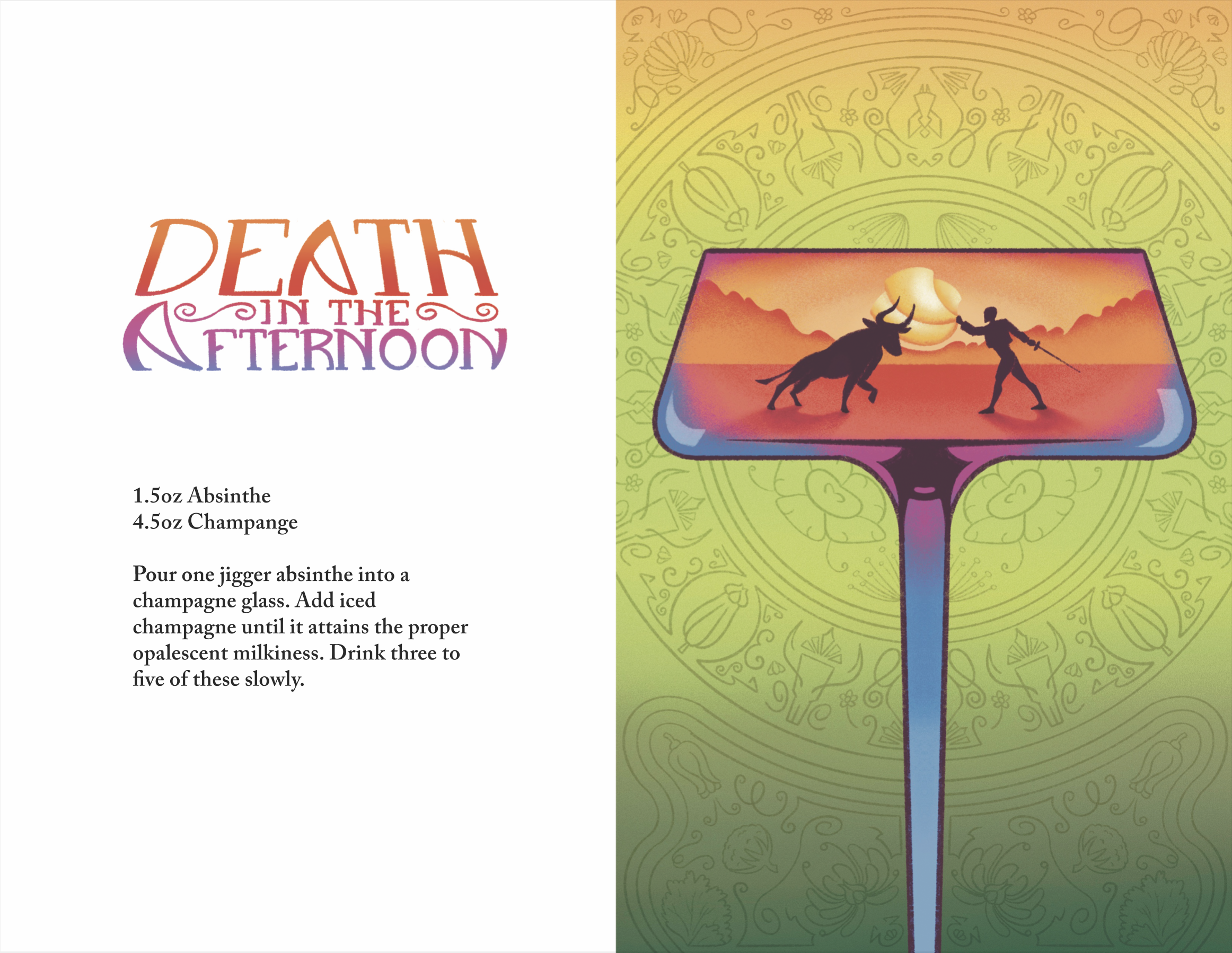 The Death in the Afternoon Cocktail is credited to Ernest Hemingway and named after his book about Spanish bullfighting. Art nouveau advertisements for absinthe inspire the background. It features the green anise, sweet fennel, and wormwood used in absinthe.